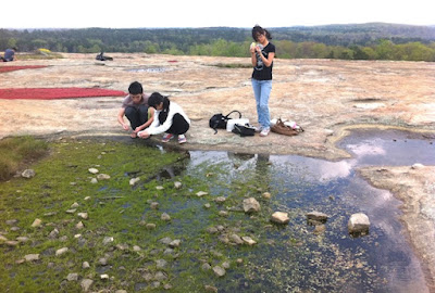 Oxford students gather microbial samples from Arabia Mountain. While the plants and geology of the granite outcrop have been studied in detail, its microbes have not. Photo by Nitya Jacob.She found the perfect fit as a teacher at Oxford College, which has easy access to forests, the Oxhouse Science Center and the Arabia Mountain National Heritage Area. The mountain is a monadnock, an exposed granite rock, rising nearly 200 feet above the piedmont. Sandy hollows in the granite surface fill with rain water and turn into vernal pools, harboring an array of unusual plants, like the bright-red diamorpha and the endangered fleshy-leafed little amphianthus, and isoetes melanospora – better known as black-spored Merlin’s grass.