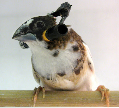 A Bengalese finch outfitted with headphones. Research on how the birds learn to sing may lead to better human therapies for vocal rehabilitation.