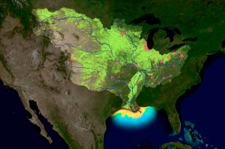 “Each summer, after the famers of the American Midwest spread manure or spray anhydrous ammonia over their emerging crops, summer rains (usually) come and carry much of that fertilizer down a massive web of tributaries into the mighty Mississippi River. The annual spike in nutrient (mostly nitrogen, phosphorous, and potassium – NPK) causes massive algal blooms. As the algae decompose bacteria feast on the detritus only to die when there is no more food taking with them dissolved oxygen. The resultant area of low oxygen or hypoxia is eerily named the ‘Dead Zone.’ This is a slight misnomer as the area is not completely dead although the lower oxygen levels do threaten large portions of the aquatic food web. In addition to oxygen deprivation a small percentage of the blooming algae also produce lethal toxins to fish, birds, and mammals. The size of the Dead Zone varies summer to summer from about the size of Delaware to New Hampshire depending on the amount of rainfall. …