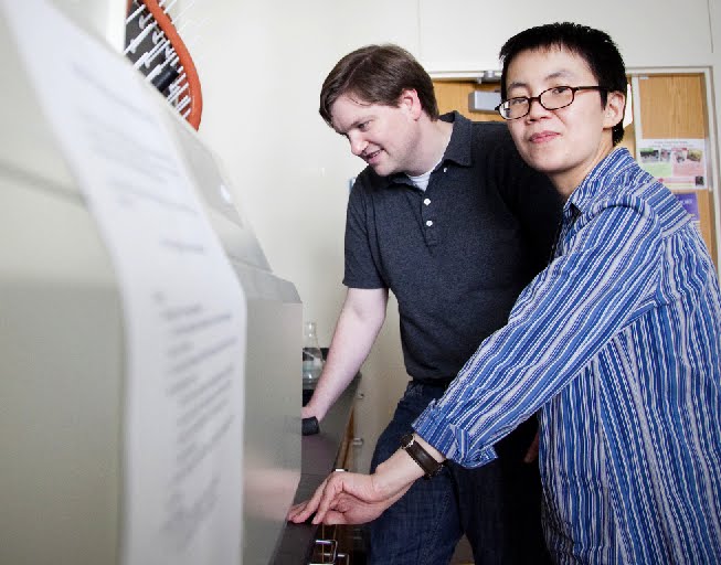 Chemistry grad student Seth Childers, left, discovered that if you just add water to simple peptides, you get the scaffold for life. Fellow graduate student Yan Liang, right, made the first real-time images of the peptides self-assembling into nano-machines. Photo by Bryan Meltz.
