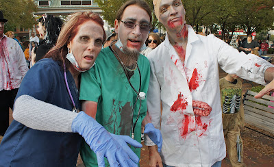 Among the questions the "Walking with the Dead" conference will tackle is why many people have embraced the zombie fad, such as these enthusiasts in Marietta Square on Saturday.