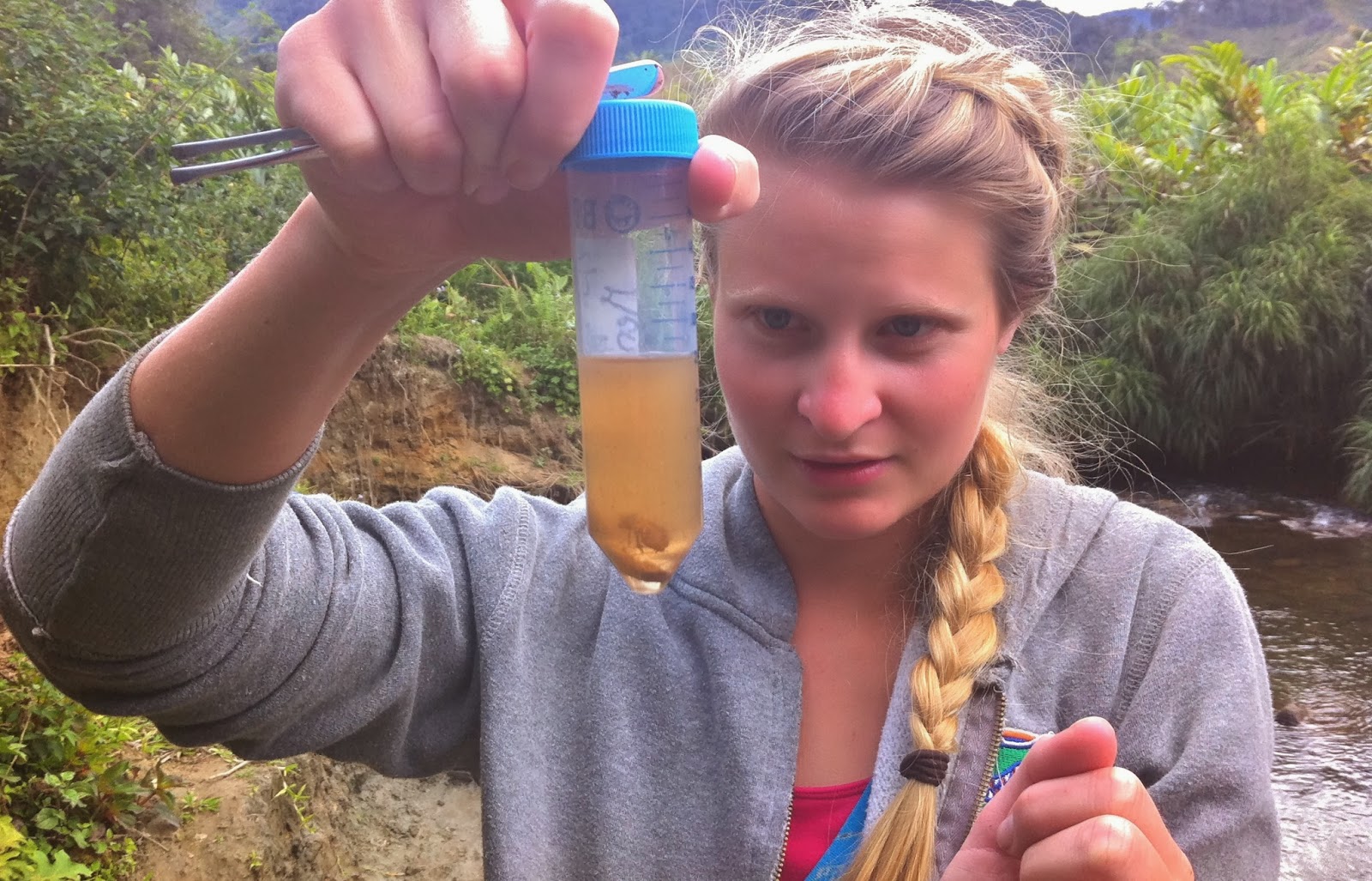 Caroline Schwaner uses rapid detection tests in the field in Madagascar to screen fecal samples for adenoviruses and rotavirus. Photo by Carol Clark.
