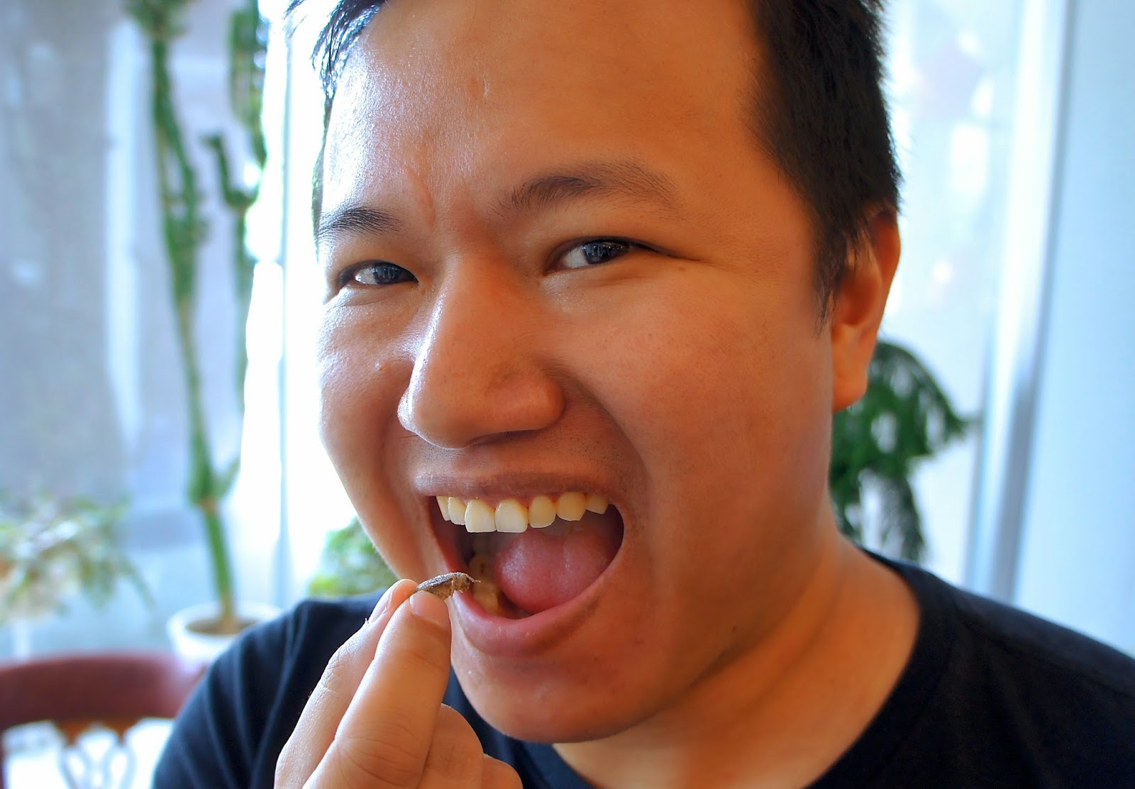 Head first: Biology post-doc Daniel Kueh dropped by the reception and learned that crickets are like potato chips. It's hard to stop at just one.